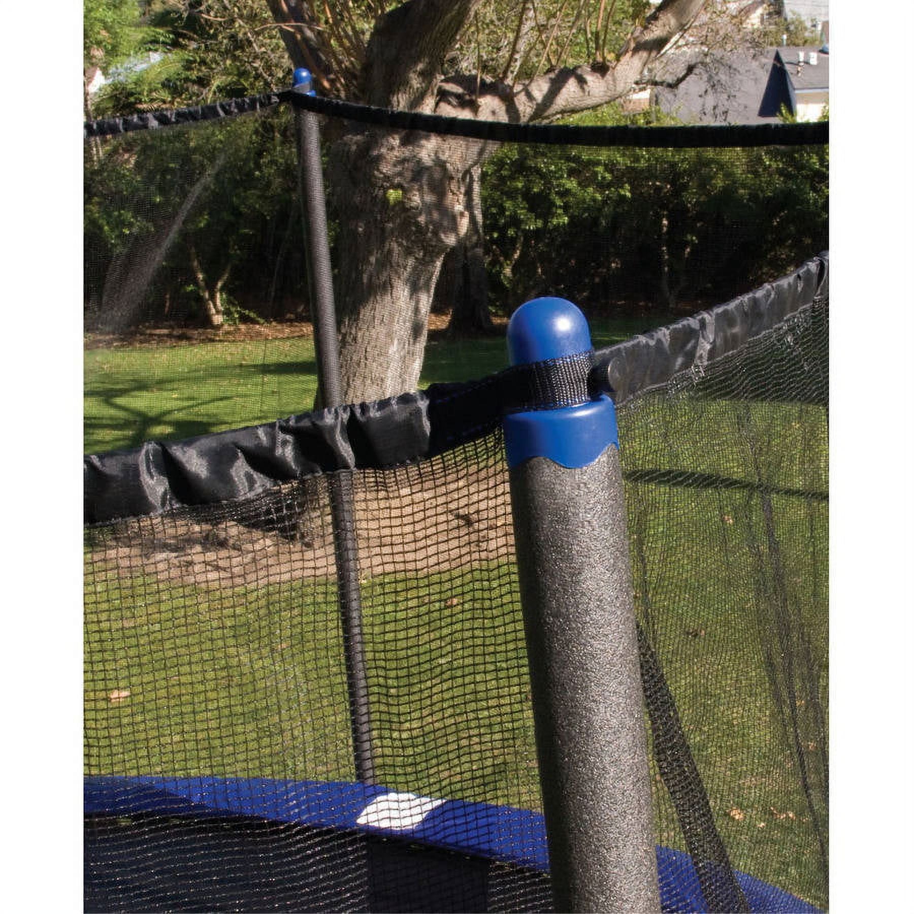 Add some safe fun to your backyard with the Airzone 8' Trampoline with Safety Enclosure in Blue. It features enclosure netting that's made of a durable, non-abrasive polyethylene mesh, which is tightly woven so little fingers and toes don't get caught. The Airzone trampoline springs are made of high-performance stainless steel protected with a weather-resistant PVC frame cover and thick sewn-in padding. It also features W-shaped legs that create two contact points for each leg to provide additional stability. This Airzone 8' Trampoline with Safety Enclosure in Blue includes a patented zippered arch that allows you to close the mesh easily and quickly. It also has an added bungee cord around the top of the enclosure that keeps netting taut and secured to the enclosure masts. This backyard trampoline can provide hours of entertainment in a safe environment.
